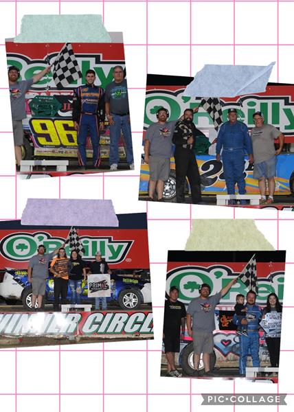 In the Primal Jerky Mini stocks ladies and gentlemen we have us a points battle!! Young gun Mr. 4 in a row Jayce Reimer started on the front row with Fast starter Gratton Dalton. With what looked to be just those two battling for the win, was almost spoiled as Tina Flauding bobbled off of turn 4 and carried that momentum into the front stretch wall and rolled over one complete time, (she was uninjured) that accident froze the competition under a Red flag. On the restart R.C. Esparza challenged for the top spot in turns 1-2, but Dalton and Reimer pulled away down the backstretch and Reimer made one last effort off of 4 as Gratton just beat him to the checkered!! Reimer 2nd, Esparza 3rd.
