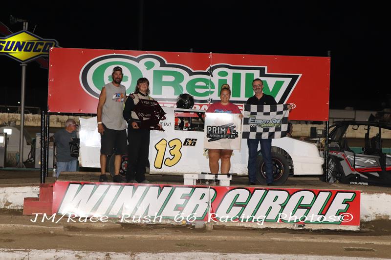 The Primal Jerky Mini Stocks had 19 cars check in on Saturday night. The young man in the 13 of Dylan Doty who started 6th in the A feature worked his way through the field and picked up another win for the 2023 season. Coming in 2nd was the young man of Titus Bortzfield with only being in the car for the second time this year. Justin Esparza took 3rd in the 18L and 4th went to the 23 of Shane Hay and 5th went to the 4K of Kasey Coleman.