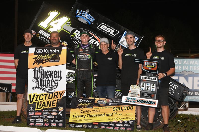 With a different design and a new sponsor at a never-before-seen track, Corey Day still did what Corey Day does on Tuesday night at Red Dirt Raceway - he even made a lucky fan $3,500 richer in the process.