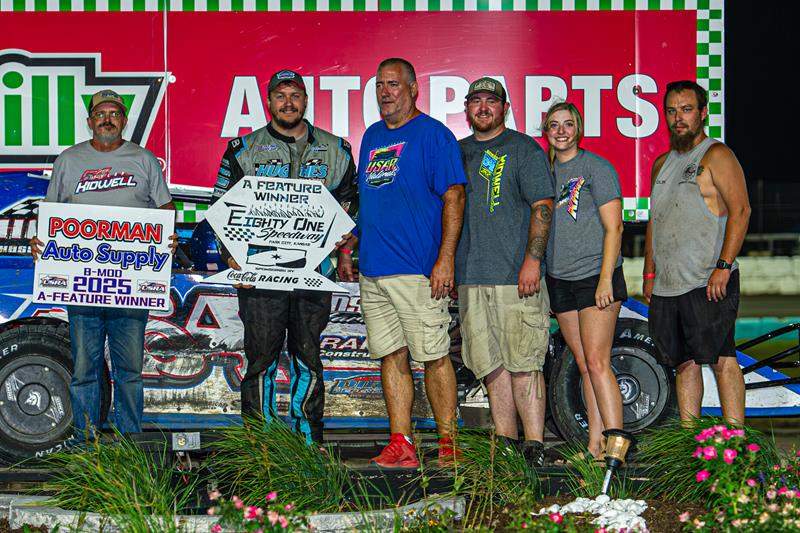 *B-Dominating: Poorman Auto Supply USRA B-Mods took to the newly re-prepped race surface. With record temperatures and high winds all day, the track crew wanted to get the track in good shape for the features. As the B-Mods took the green, the bottom proved to be a bit slimy as they careened into turn one. They stayed in line until lap 6 when, in normal Kidwell fashion, he found a way to dive to the lead. The battle heated up for spots 2-5 with 5 laps to go. Slade Mohr was inching his way to the front, passing cars to slide into second place. K.C. Mullin 3rd, Jon Sheets 4th, and “too slick” Josh Lanterman rounding out the top 5.