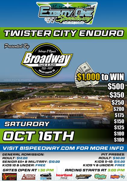 $100 pre-entry fee by 8/16/2021 or after is $150, we are only accepting the 1st 100 entries NO EXCEPTIONS. You may pay and register at the track at the races prior to the enduro or you may send registration and money to: 81 Speedway 7700 N. Broadway Park City KS 67219